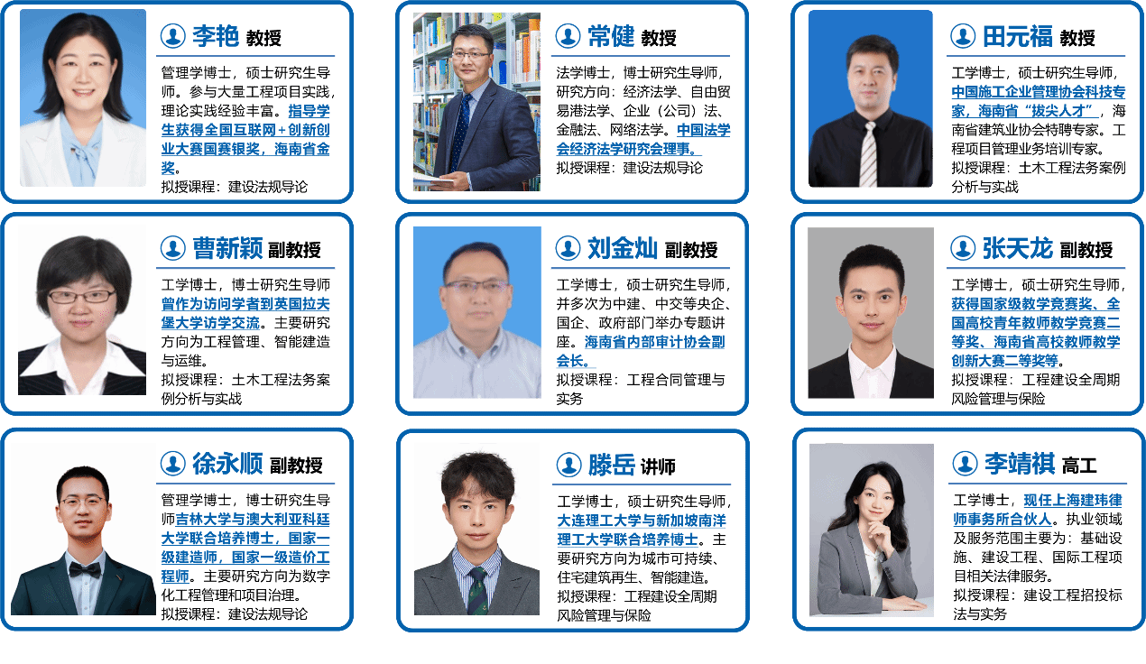 本微专业由sunbet牵头建设,专业负责人为李艳教授。教学团队成员来自sunbet、法学院、审计处、基建处及上海建玮律师事务所,具有工程管理、土木工程、金融法及建设工程法律等多元背景。拟授课程覆盖建设法规导论、工程合同管理与实务、工程建设全周期风险管理与保险、建设工程招投标法与实务、土木工程法务案例分析与实战等。